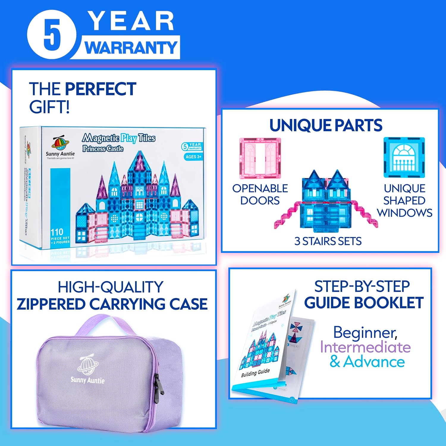 【Princess Castle Magnetic Tiles】110 PCS Deluxe Set|Zippered Case + 2 Dolls|STEM Creative Toys