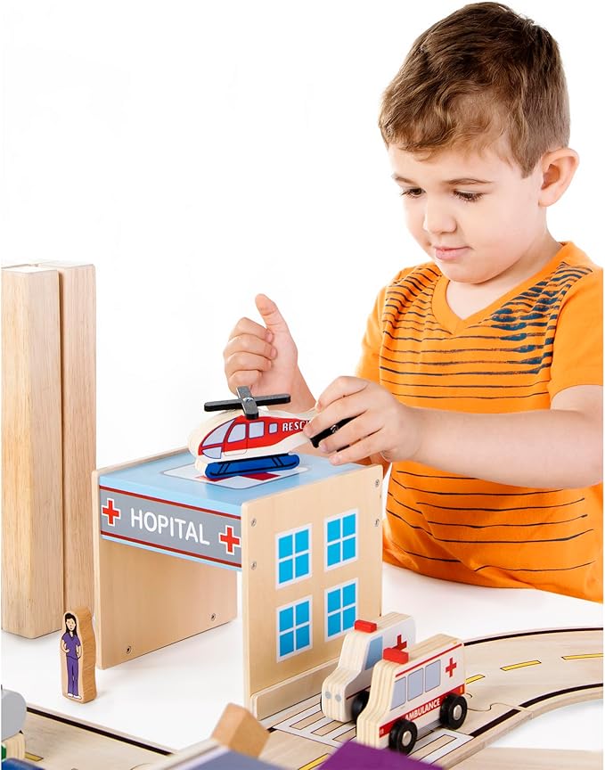 ✅ 6棟樺木膠合板建築:消防局、警察局、醫院、學校、超市和加油站