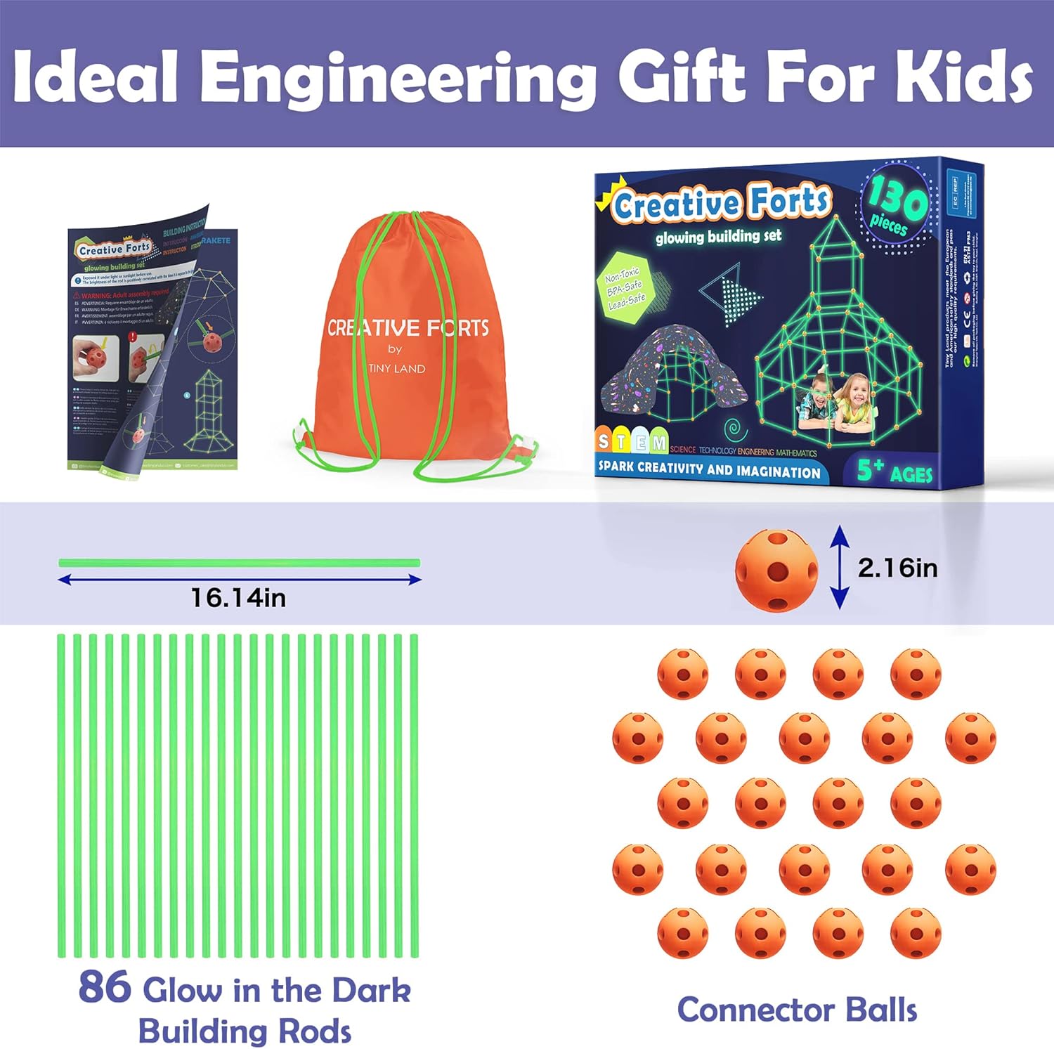• 130 glow pieces (44 balls + 86 rods)