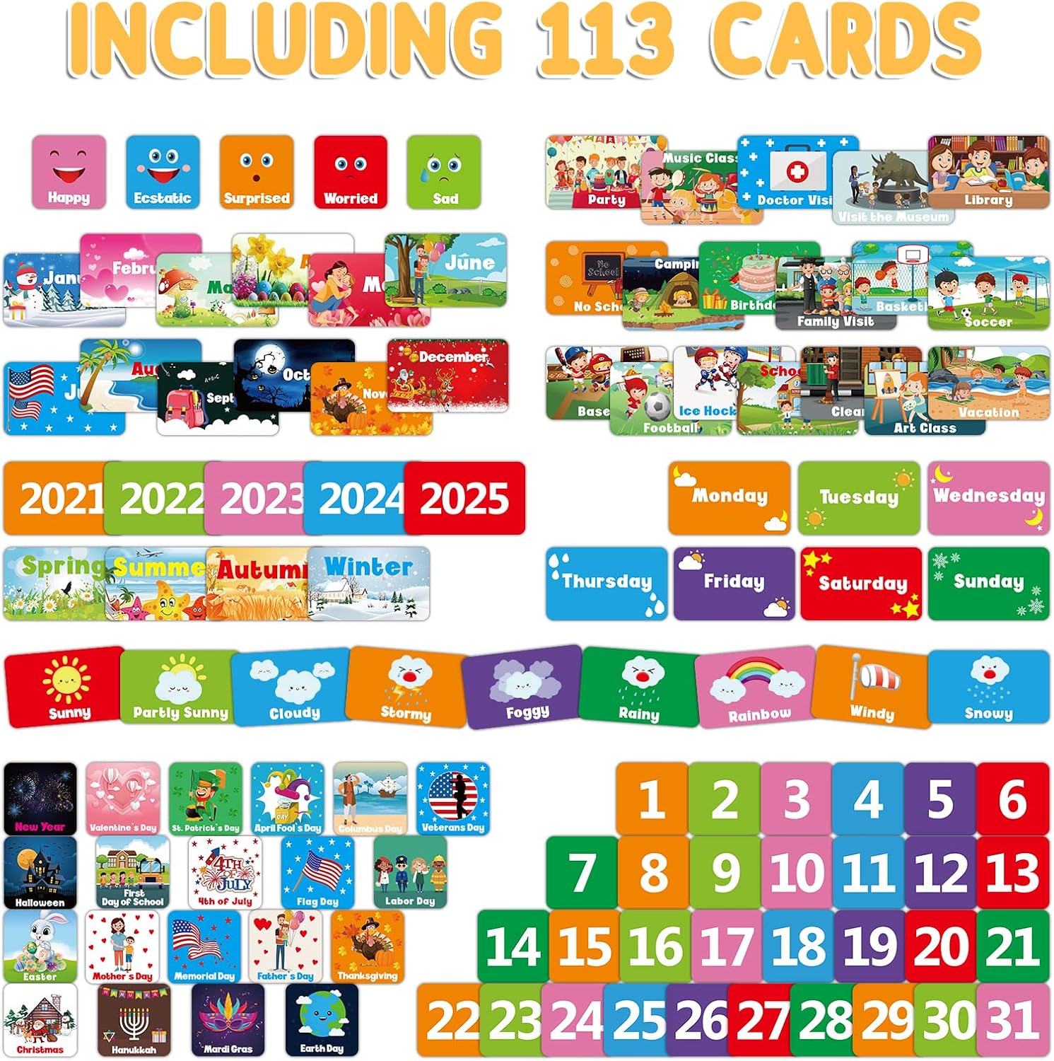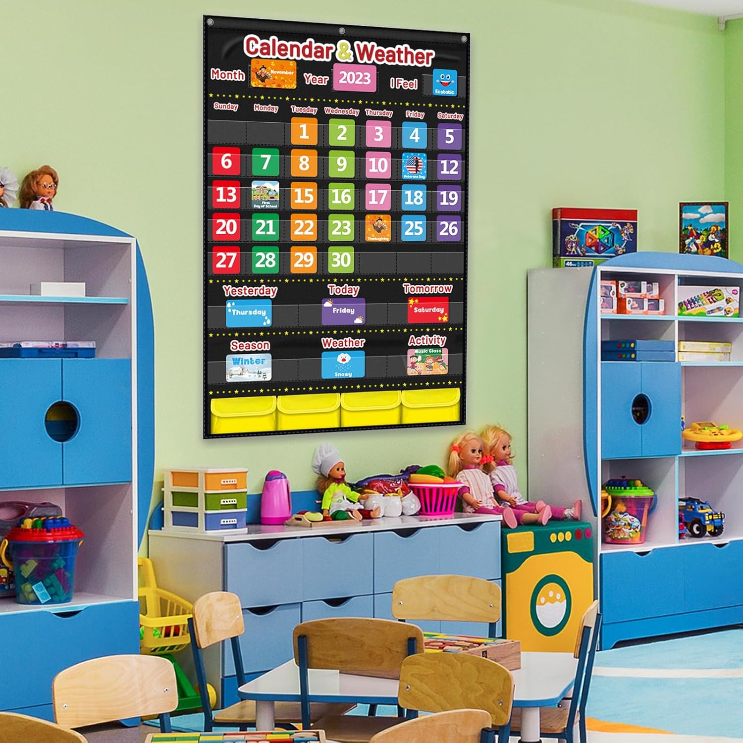 🌟【Calendar & Weather Pocket Chart】44.5"x28" Educational Calendar Set|113 Learning Cards|Special Education Time Concept Tool