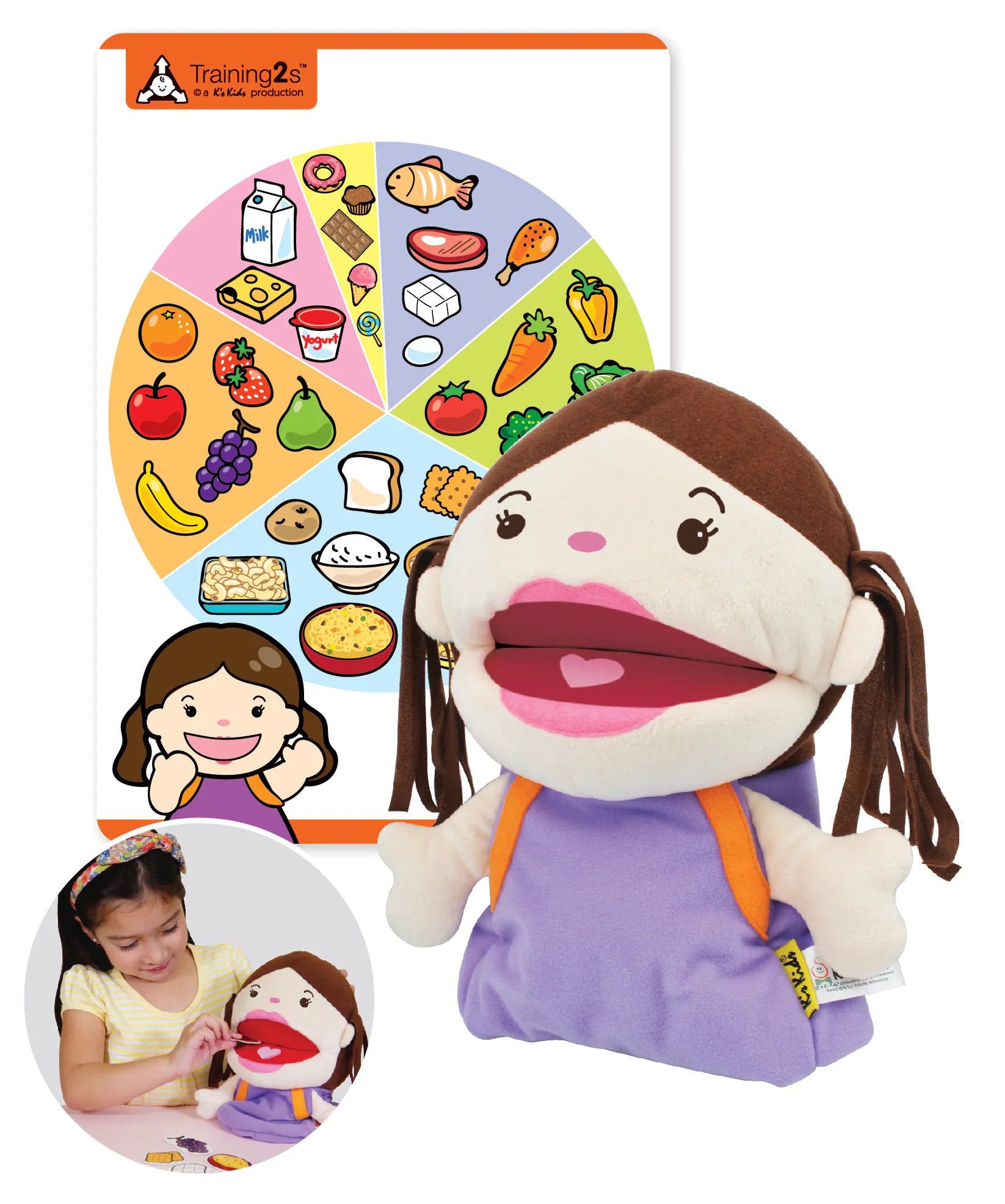 • Includes: 1 hand puppet, 34 food cards, 1 food pyramid card