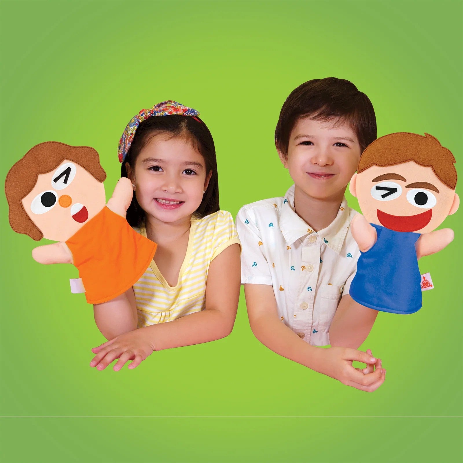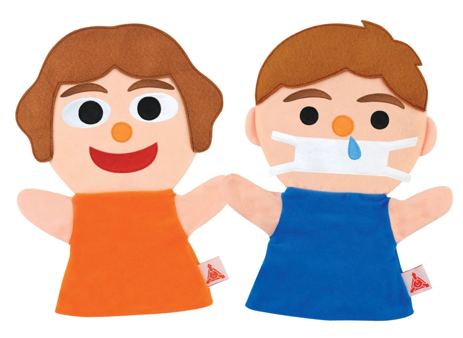 • Two hand puppets + 14 interchangeable facial features & accessories (eyes, mouths, eyebrows) – mix & match to create happy, sad, angry, surprised & more