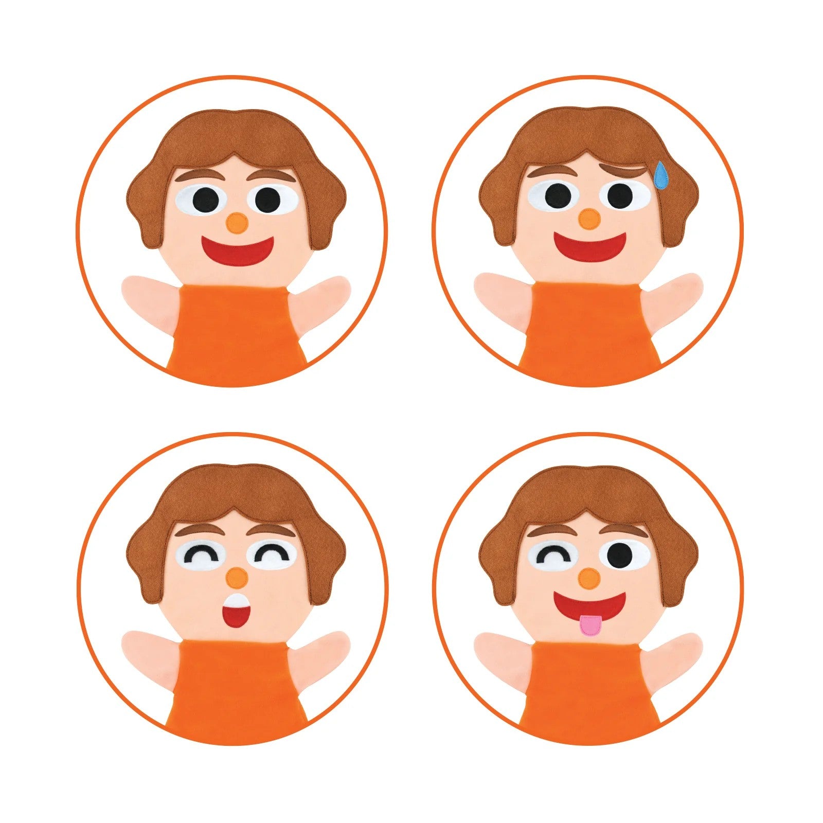 • 使用兩隻手偶 + 14件可更換臉部配件(眼睛、嘴巴、眉毛等),父母可自由組合不同情緒(如開心、生氣、傷心、驚訝)